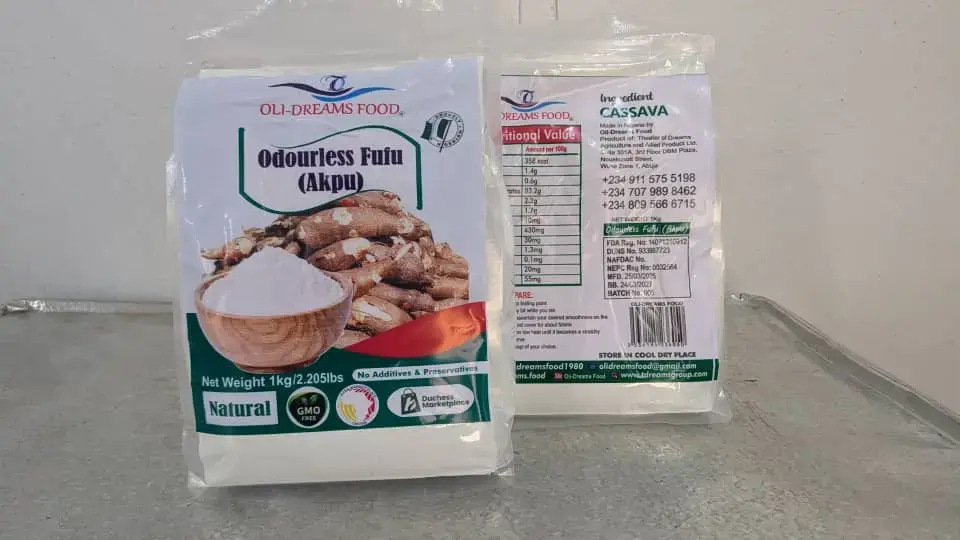 Enjoy the traditional Nigerian dish without the strong smell. Oli-Dreams Odourless Fufu (Akpu) is made from 100% cassava and processed in Nigeria to remove odor while keeping the original taste and smooth texture.